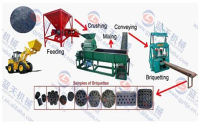 Carbonization furnace---charcoal crusher---binder mixer---wheel mill---conveyor belt---dosing machine---briquette machine---box dryer.